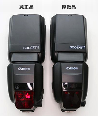 弊社の調べによりますと、一眼レフカメラ/ミラーレスカメラ用アクセサリーのスピードライト600EX-RTの純正品であるかのように偽った「模倣品」が出回っていることが確認されました。これら「模倣品」は、海外のインターネットサイトで販売されていることが報告されております。「模倣品」は、弊社が設計、生産したものではないにもかかわらず、キヤノンのロゴ・商標などを不正に表示したものであり、キヤノン株式会社の商標権を侵害するものです。