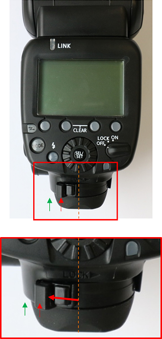 純正品は左端位置(緑矢印)、模倣品は中心寄りの位置(赤矢印)