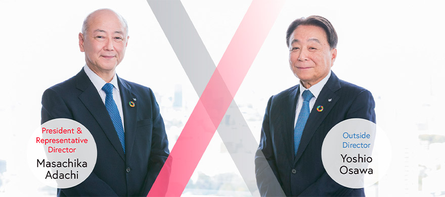 President & Representative Director Adachi and Outside Director Osawa held a dialogue on governance initiatives, embodying the purpose, business development, and talent acquisition and development.