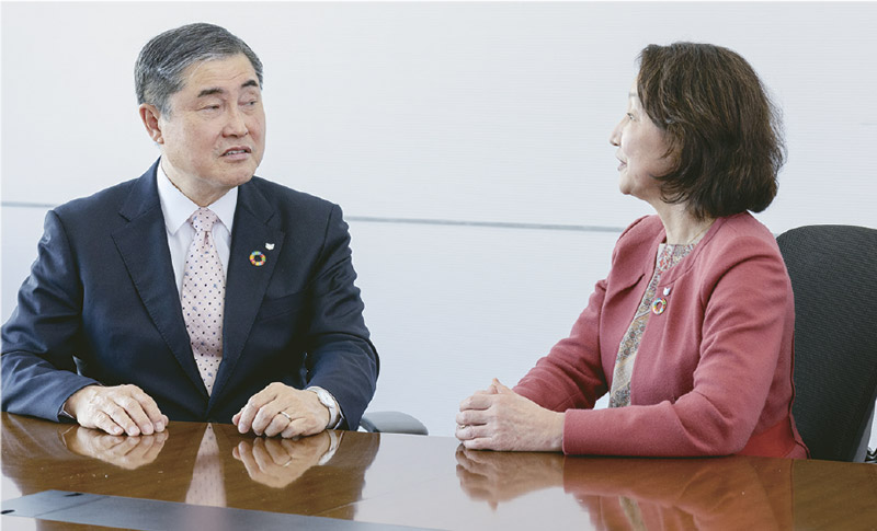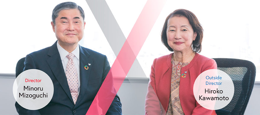 Director Mizoguchi and Outside Director Kawamoto held a discussion on how the Canon MJ Group is putting its Purpose into practice, advancing the sophistication of its human capital, promoting womenʼs empowerment, and strengthening governance.
