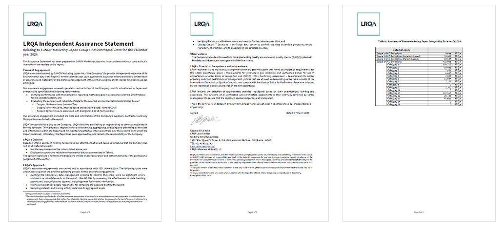 The Canon MJ Group conducted third-party verification of its 2024 greenhouse gas (GHG) emission data (Scope 1, Scope 2 and Scope 3)* in compliance with the ISO 14064-3 international standard, and received an assurance statement from certification authority LRQA Limited.