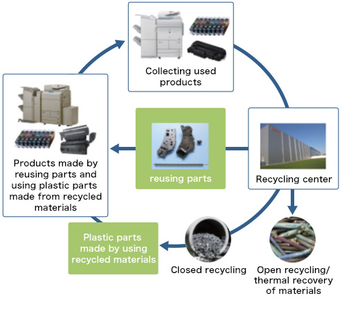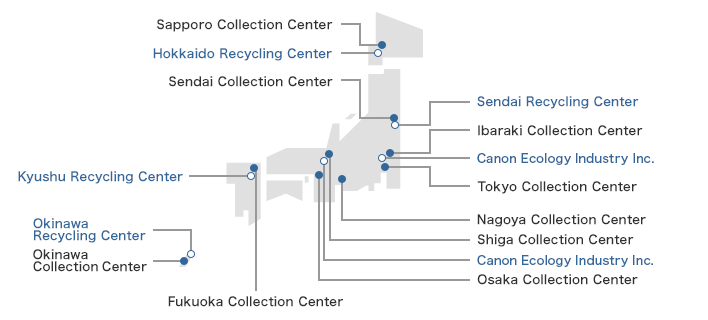 Canon products that have been used at offices and other locations are collected at nine collection centers in Japan. We recycle the used products within the Group by working together with the Canon Ecology Industry Inc. which are the recycling centers of the Canon Group.