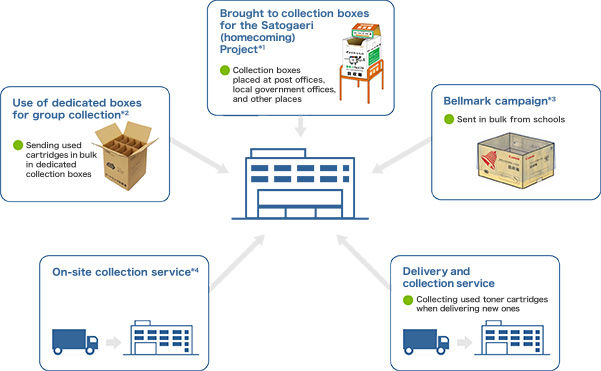 Canon recycles used cartridges, regarding them as valuable resources. We make effective use of used cartridges collected from customers as resources, instead of landfilling them. This activity of collecting and recycling used cartridges is made possible by customers' cooperation. We have therefore prepared various collection routes in response to the needs of cooperating customers.