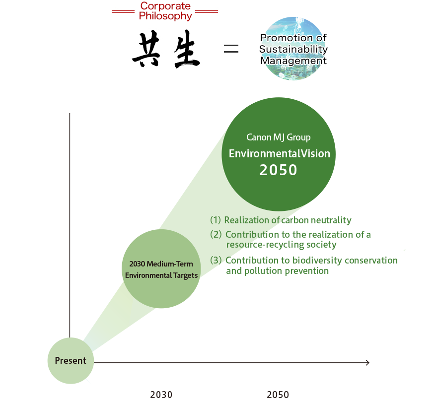At the Canon Marketing Japan Group, we drive sustainability management under the Canon Group's Kyosei corporate philosophy. To build a sustainable society, we have formulated the Canon MJ Group Environmental Vision 2050 and the Canon MJ Group 2030 Medium-Term Environmental Targets as milestones toward the achievement of the Vision, and are implementing initiatives accordingly.