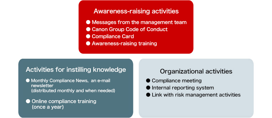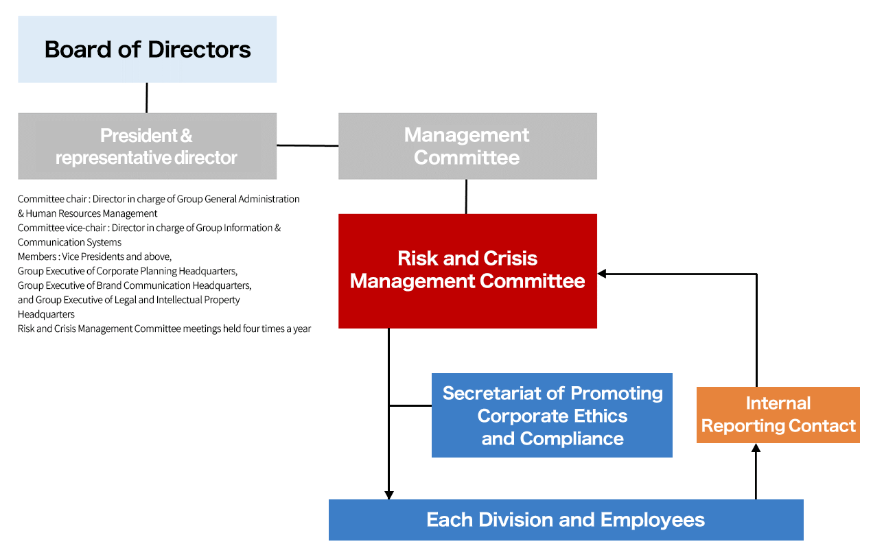 At the Canon MJ Group, we are raising and promoting awareness of corporate ethics and compliance by advancing the development of a compliance system based on the Canon Group Code of Conduct. This is led by the Risk and Crisis Management Committee chaired by the Director and Senior Managing Executive Officer (in charge of Group General Administration & Human Resources Management).
