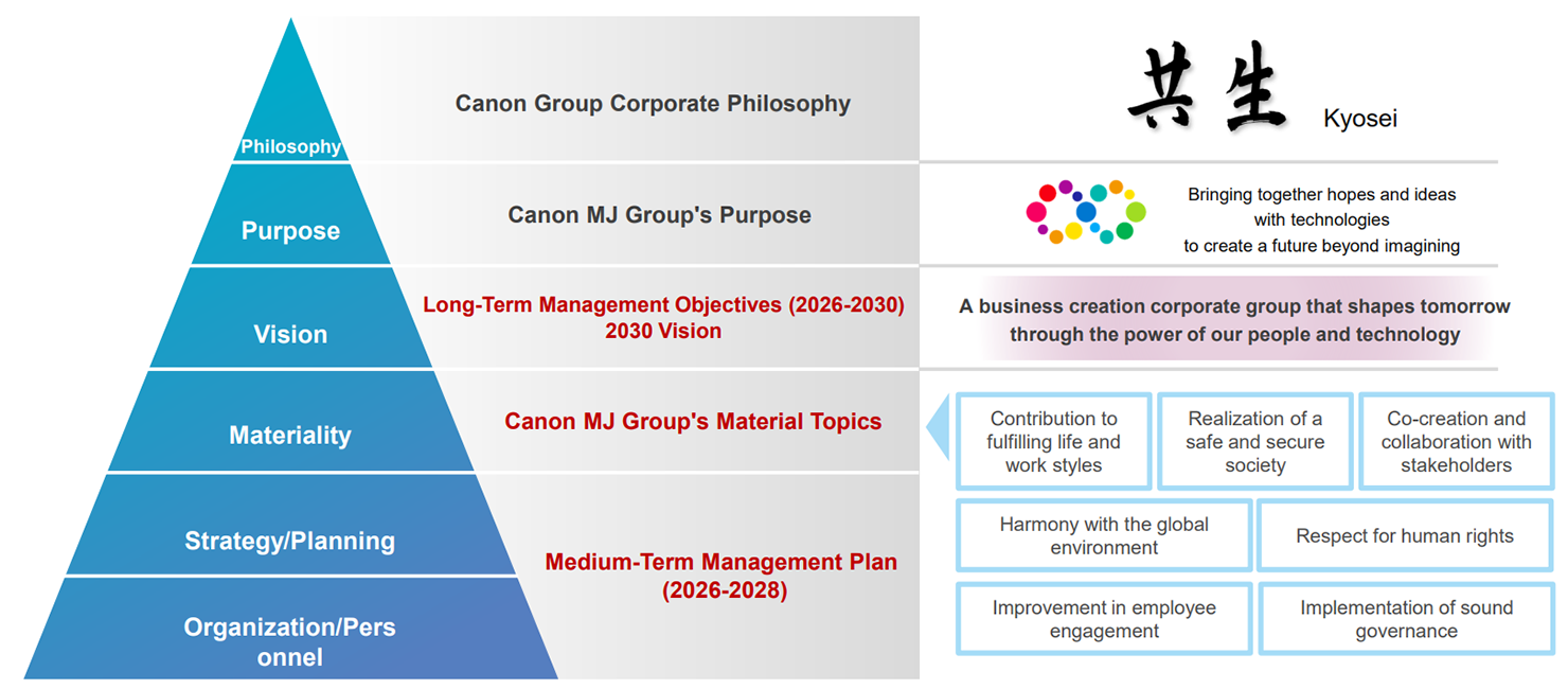 The Canon Marketing Japan Group (hereinafter, the "Canon MJ Group") defines material topics as "themes of high importance to the Canon MJ Group and its stakeholders that should be addressed intensively." We have established an end-to-end management framework that connects our corporate philosophy with our Purpose, Long-Term Management Objectives, material topics, and Medium-Term Management Plan, and we carry out actions to tackle the material topics in an effort to achieve our corporate philosophy and our Purpose.