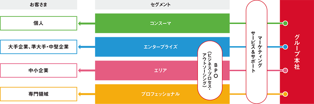 多様化・高度化するお客さまのニーズに対し、最適なご提案ができるよう、4つのセグメントに分けた市場・顧客別の営業組織体制を構築しています。セグメントに関わらないマーケティング、サービス&サポート機能が各セグメントをサポートするとともに、バリューチェーンを俯瞰した商品・サービスの強化と生産性の最大化を促進しています。