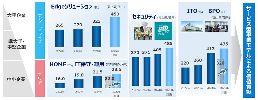 当社グループが強み(Edge)とする領域・業種および技術にフォーカスしたソリューションを「Edgeソリューション」と表現し、現在「映像ソリューション」「デジタルドキュメントサービス」「数理・需要予測」「ローコード開発」の4つの領域で提供している。Edgeソリューションでは、現在保有する様々なソリューションの強みをさらに磨き、“他社の追随を許さない”ITソリューションを創出するとともに、領域を拡大していく。また、顧客基盤を活かし、大手企業のお客さまと個別に創出したソリューションを、同業種のお客さまへ展開を行うとともに、そのソリューションをサービス化し、準大手・中堅企業や中小企業への展開を行うことでサービス型事業モデルを確立していく。