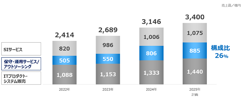 - サービス型事業モデルの拡充、M&Aの実行による保守・運用サービス/アウトソーシングの金額・構成比が伸長