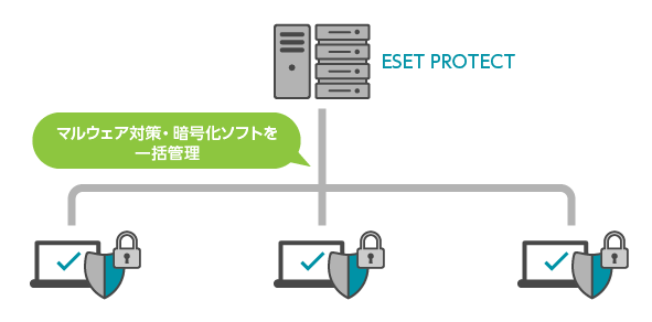 また新バージョンとなった、ESET セキュリティ ソフトウェア シリーズの統合管理システムである“ESET PROTECT”※4から、暗号化状況やプリブート認証のパスワードポリシーなどを管理することが可能です。そのため、マルウェア・ランサムウェア等の外的脅威への対策とあわせた包括的な管理が行え、管理者の運用負荷を低減することが可能です。