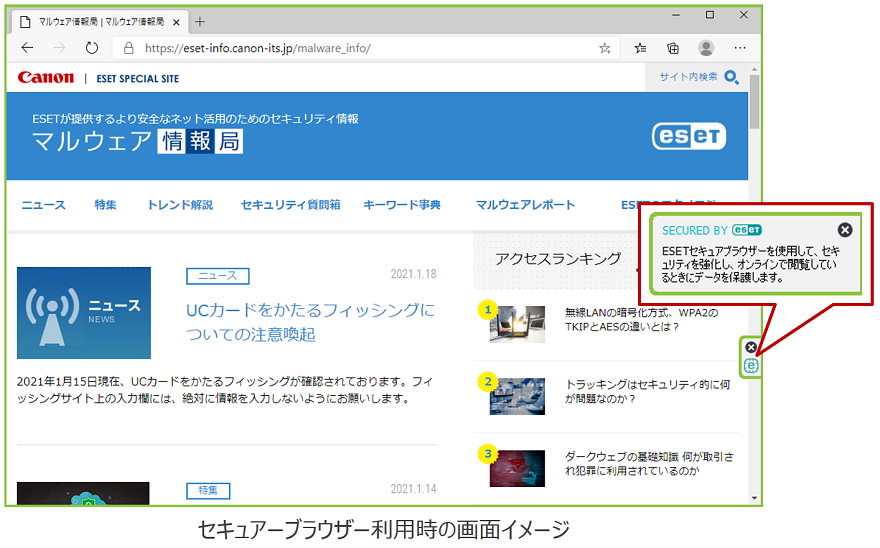 「セキュアーブラウザー」は、主要なブラウザーをESETの保護下で実行し、ブラウザーを介した情報窃取を防ぎます。昨今オンラインサービスの利用が浸透し、ブラウザーで重要情報を入力する機会が増える中で、Emotetのような情報窃取を行うマルウェアに万が一感染したとしても、パソコンからの情報漏洩リスクを低減することができます。