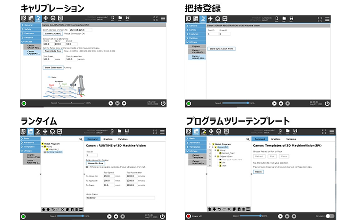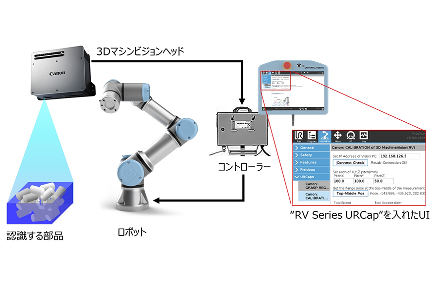 今回、キヤノンの3Dマシンビジョンシステム「RVシリーズ」は、協働ロボットのリーディングカンパニーであるUR社の「UR+」認証を取得しました。それに合わせ、UR社製協働ロボット専用のロボットコントローラー用プラグイン“RV Series URCap”の無償提供を開始します。“RV Series URCap”を用いることにより、キャリブレーション用プログラムの作成が不要となり、ピッキング用ロボットプログラムが簡単に作成できるなど、ロボットの「眼」となる3DマシンビジョンとUR社製協働ロボットとの連携が容易になります。