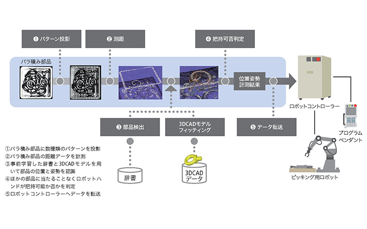 数種類のパターン光を投影し、距離画像と濃淡画像を同時に取得します。事前登録しておいた部品の3DCADモデルをフィッティングすることで、さまざまな形状の部品を高精度に3次元認識することが可能です。
