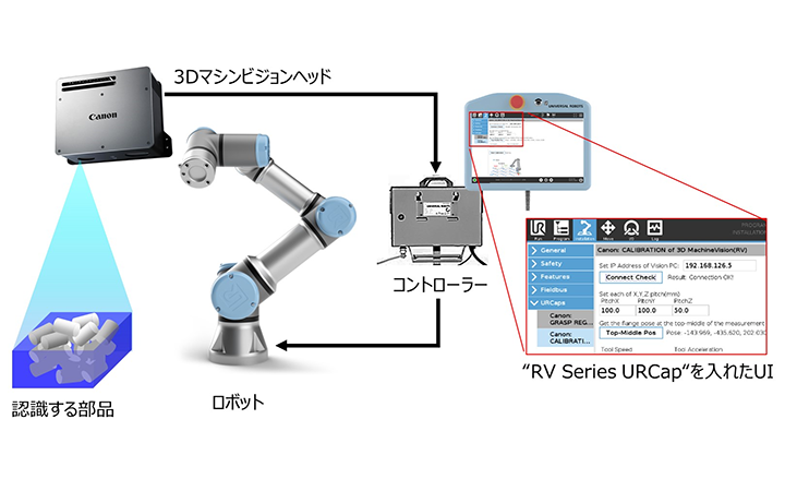 ロボットの眼となるキヤノンの3Dマシンビジョンシステム「RVシリーズ」が、ユニバーサルロボット社(以下「UR社」)の認定製品プラットフォーム「UNIVERSAL ROBOTS+」(以下「UR+」)の認証を取得しました。これに伴い、UR社製協働ロボットのユーザー向けに、ロボットコントローラー用プラグイン※“RV Series URCap”を本日より無償提供します。