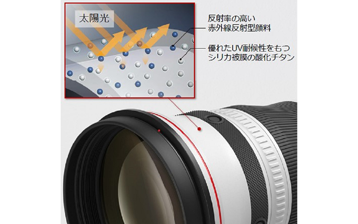 太陽光に含まれる赤外線の反射率を高めた遮熱塗料を採用し、屋外スポーツなどの炎天下における長時間撮影でもレンズの温度上昇を低減します。また、マウント部、スイッチ部、フォーカスリングなどに防じん・防滴構造を採用※3し、最高水準の性能を追求した「L(Luxury)」レンズにふさわしい信頼性を確保しています。