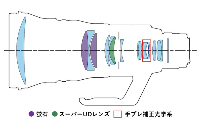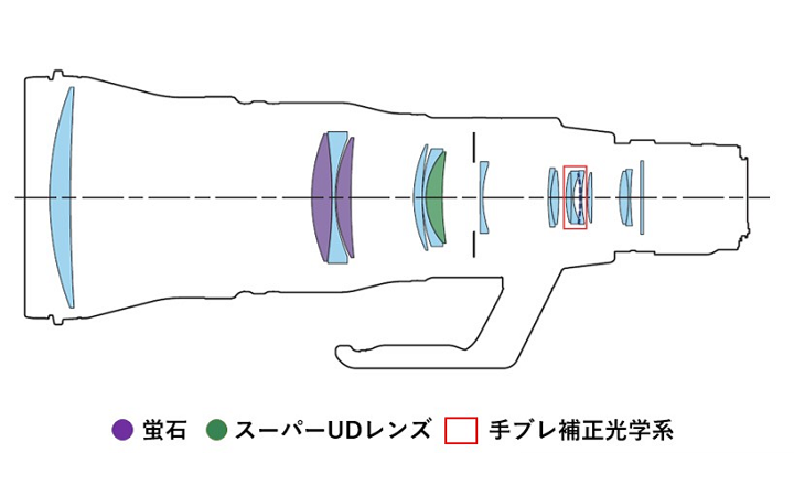 高画質と大幅な軽量化を実現した「EF400mm F2.8L IS III USM」および「EF600mm F4L IS III USM」と同様、蛍石レンズ2枚とスーパーUDレンズ※11枚を含む13群17枚の光学設計により、レンズの大きさや重さを抑えながら、色収差を良好に補正し、高解像・高コントラストを実現しています。また、特殊コーティング「ASC(Air Sphere Coating)」を採用し、画質劣化の原因となるフレア・ゴーストを抑制しています。さらに、RFマウント化にともない、手ブレ補正制御の最適化を図り、5.5段※2の手ブレ補正効果を実現しています。