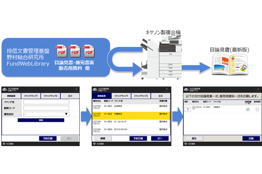 このほど、キヤノンMJとNRIは西日本シティTT証券に、NRIの投信文書プラットフォームサービス「FundWeb Library」※2からPCレスで簡単に複合機※3の操作パネル上で必要なデータを参照、検索し印刷が可能な証券会社向け“目論見書オンデマンド印刷システム”を構築しました。
