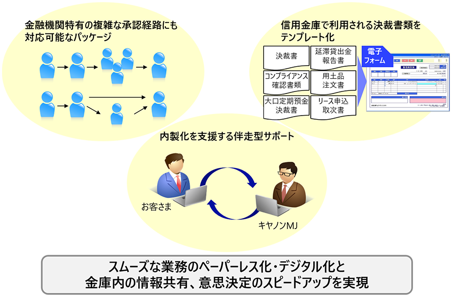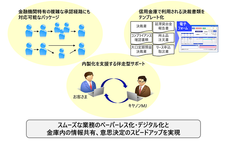 このたびキヤノンMJとキヤノンITSは、“信金業界向け 承認ワークフローシステム”を大垣西濃信金と共に構築し、金庫内の業務手続きのワークフローの自動化を実現しました。本システムは、ワークフローのデジタル化と運用ルールの統一を内製化できる柔軟性の高い「WebPerformerWf」とテクニカルサポートを組み合わせた伴走型のソリューションです。支払いや資金関連の決済に関する申請書、報告書など信用金庫特有の業務フローのテンプレートを利用し、活用ノウハウを含めスムーズな構築・導入を提供します。