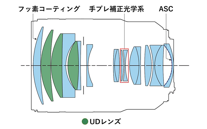 UD(Ultra Low Dispersion=特殊低分散)ガラスを用いたレンズ。