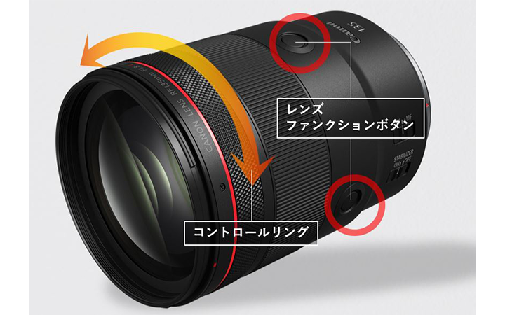 超望遠レンズ以外ではキヤノン初となる、レンズファンクションボタンを2個搭載しています。初期設定では、AFストップボタンとして機能し、AF中にボタンを押すとAFを一時中断することができるため、撮影距離を保持したい場合やサーチ駆動を避けたい場合に有用です。また、露出補正や絞り数値の設定などを任意に割り当てて使うことができるコントロールリングを搭載しています。電子ビューファインダー(EVF)で撮影後のイメージを確認しながらコントロールリングを操作することで、より直感的で快適な撮影が可能です。