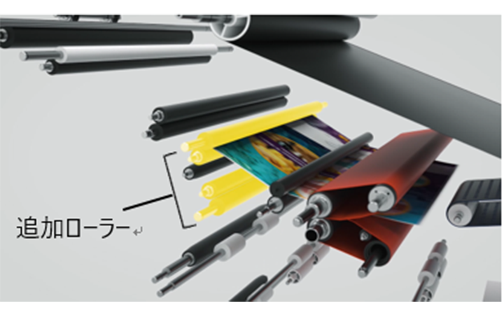 「imagePRESS Vシリーズ」最小となる本体は、最小構成時には従来機種※2より設置面積を約37%削減※3し、設置場所の自由度を高めました。長尺紙をはじめとするさまざまな用紙を格納できる給紙ユニットや、中綴じ製本が可能なフィニッシャーなど、オプションユニットを追加すれば機能を拡張することもできます。また、52g/㎡から350g/㎡の厚さの用紙に対応※4し、折込チラシなどの薄紙から、グリーティングカードなどの厚紙まで印刷可能です。封筒印刷では、ダイレクトメールなどの送付に使用される長形4号サイズにも新たに対応し、本製品1台で多様な印刷ニーズに応えます。