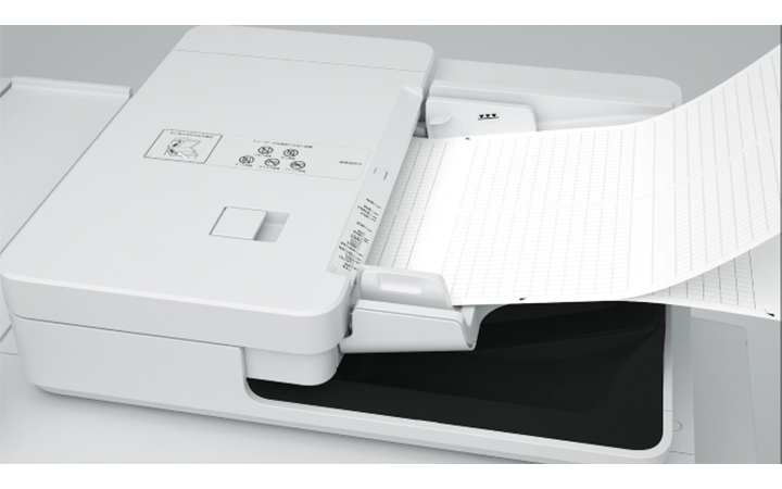 自動原稿送り装置(ADF)に調整チャートをセットしスキャンするだけで、印刷前の印字位置合わせや色合わせ調整が可能です。圧板の開閉など、従来の手作業による煩雑な調整が不要なため、作業ミスの低減と作業時間の短縮につながります。また、これまで上位機種※5でしか採用されていなかったオプションのインライン分光センサーを使用することで、高い色再現性が求められる商品カタログなどを印刷する際も、高精度な色調整がボタン操作一つで実施できます。