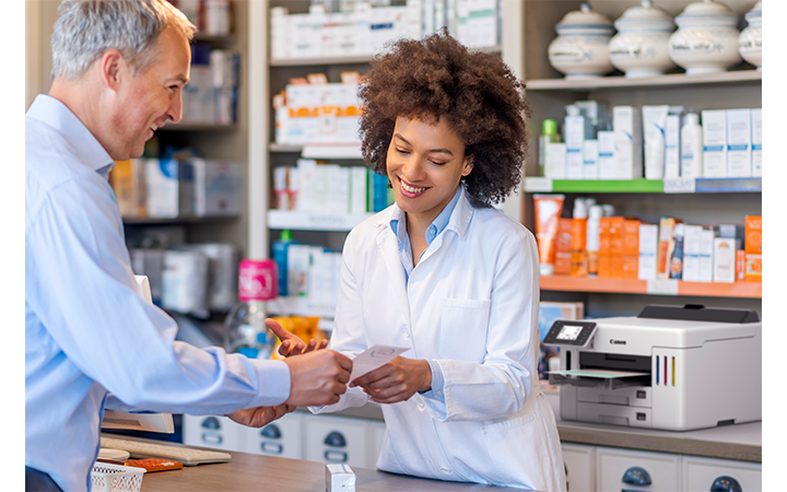 物流・薬局・小売りの業務では、宅配ラベル・薬袋・プライスカード・POPなど、種類やサイズが異なる多様な用紙への印刷が行われています。これらの印刷においては、用紙の種類ごとにプリンターを使い分けたり、プリンターが用紙サイズに対応していない場合は出力後に裁断したりという手間がかかるほか、大量印刷時の印刷コストや、給紙・インク交換の頻度の高さが課題となっています。”GX5530”は一台でさまざまな用紙に対応し、低ランニングコストかつ大容量の給紙・インクで現場の高生産性に寄与します。