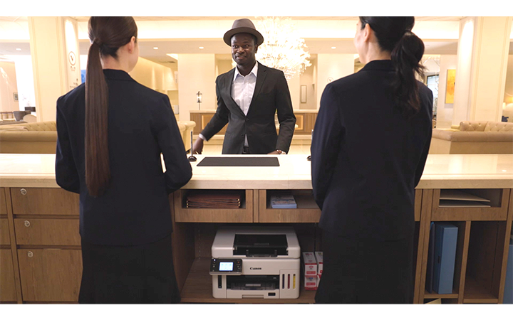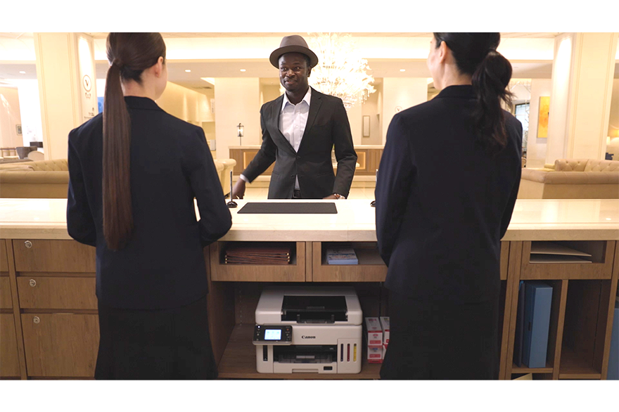 ホテルや金融などお客様と対面する受付業務や窓口業務では、身分証明書のコピーや契約書の印刷など、接客をしながらさまざまな紙文書の処理を行っています。対面業務では、お客様を待たせない、コミュニケーションを分断させないといった接客が求められますが、一方でスペースに制約のある接客現場にはプリンターを設置できず、お客様の元を離れバックヤードで作業をしなければならないケースがあります。新製品は、プリンターの前面から操作するADFの採用により、左右にスペースのない棚の中や高さの制約があるカウンターの下にも無理なく設置でき、対面業務でのスムーズな接客をサポートします。