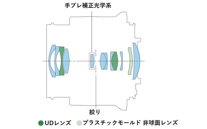カメラ側の電子歪曲収差補正を生かした小型・軽量設計により、質量約150g、全長約44.9mm(収納時)の優れた携帯性を実現しています。また、2枚の「UDレンズ※1」、1枚の「プラスチックモールド非球面レンズ」を含む10群12枚のレンズ構成により、レンズ枚数を抑えた小型・軽量設計と優れた描写性能を両立しています。さらに、「UDレンズ」の効果的な配置により、ズーム全域で色収差を補正し、画面全体での高画質を実現しています。
