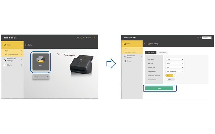 PCやスマートデバイスにドライバーや専用アプリケーションをインストールせずに、WEBブラウザ上でスキャナーのIPアドレスを入力しスキャン・出力の設定を行うだけでスキャンを実行できます。初期設定にかかる手間を大幅に削減します。