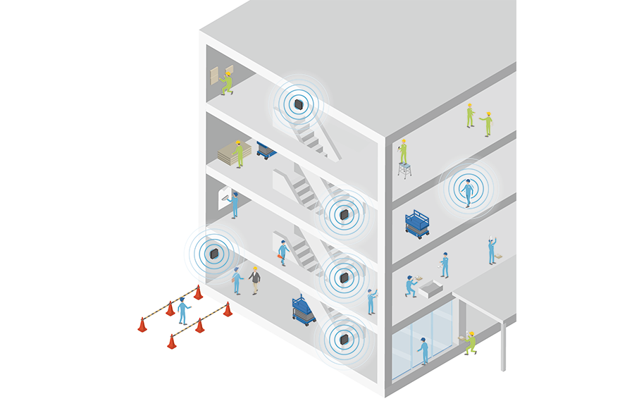 - 現場で働く多くのヒトの位置を把握し、分析することで、業務効率化、業務計画の最適化、現場の安全管理に貢献。