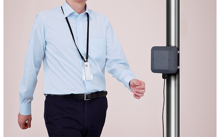 キヤノンは可搬型・固定型の2種類のRFIDリーダーを独自開発しました。いずれも、特定小電力規格に対応しており、正面方向の半径3~4メートル程度の読み取りが可能です※2。可搬型は小型・軽量で、装着しているヒトの移動量検知機能を搭載しているため、リーダーを携帯して巡回しながらヒト・モノの位置を把握したい場合に適しています。固定型は常時給電できるため、ヒトが頻繁に通過する出入口を24時間監視したい場合などに適しています※3。