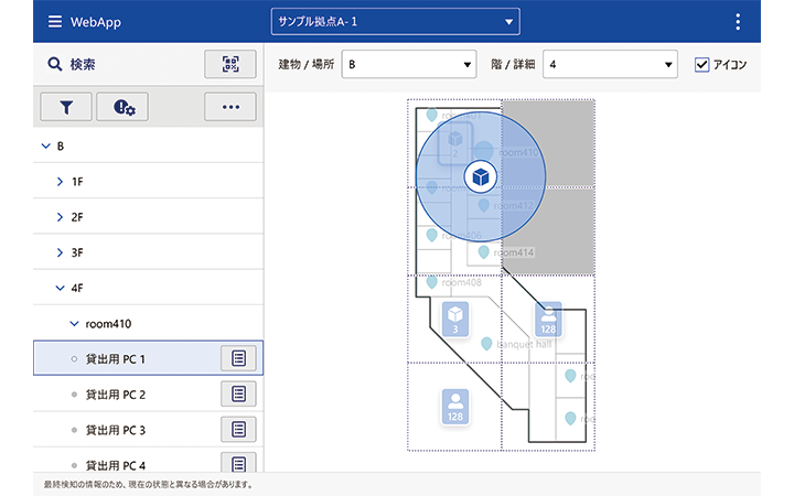 - 今回開発した標準ウェブアプリでは、タグをつけたヒト・モノのマップ上でのおおよその所在位置や、所在階などの情報を把握することが可能。