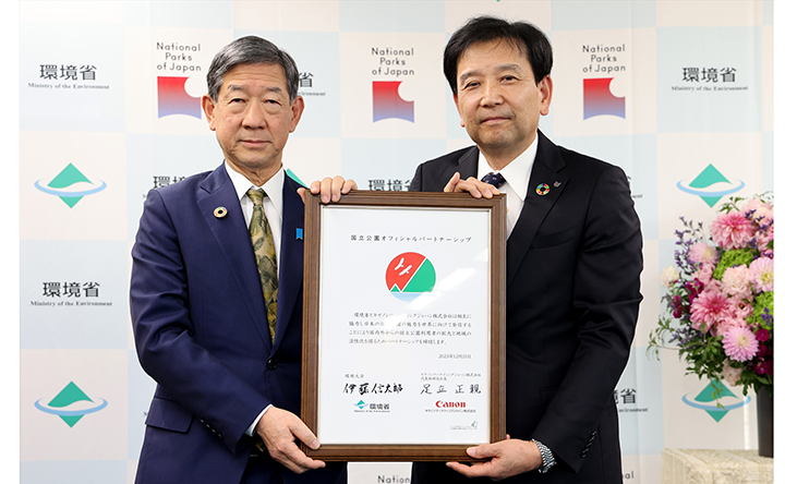 キヤノンMJグループは、キヤノングループが掲げる企業理念「共生」のもと、サステナビリティ経営を推進しています。持続可能な社会の実現に向け、「キヤノンMJグループ環境ビジョン2050」および中間目標である「キヤノンMJグループ2030年中期環境目標」を策定し取り組んでおり、この度、環境省の主旨に賛同し、国立公園の魅力発信などに寄与するべく、パートナーシップを締結しました。