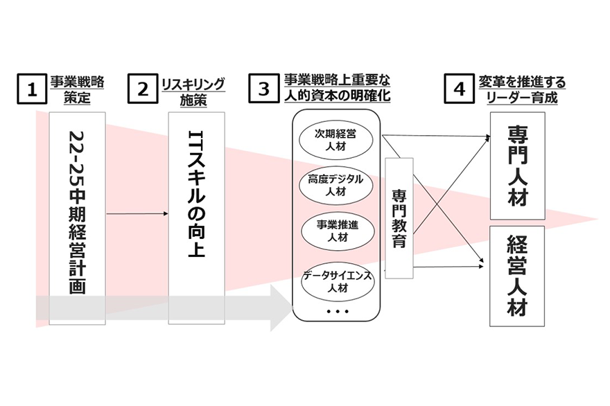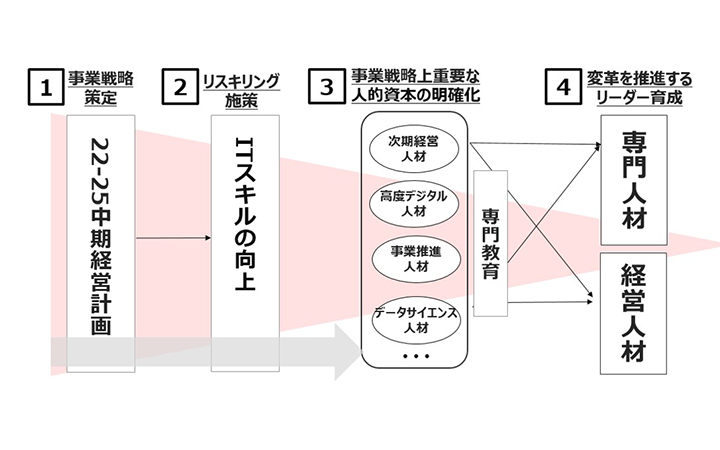 事業構想やデータサイエンス、デジタルマーケティングといった、どの事業にも共通して必要とされる高度なスキルの向上施策を、特定の社員に対し実施しています。