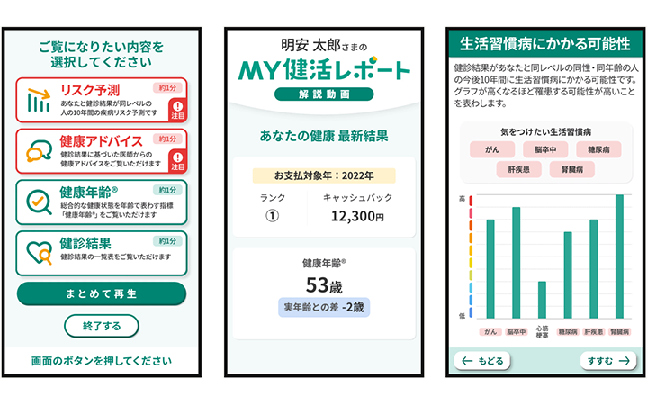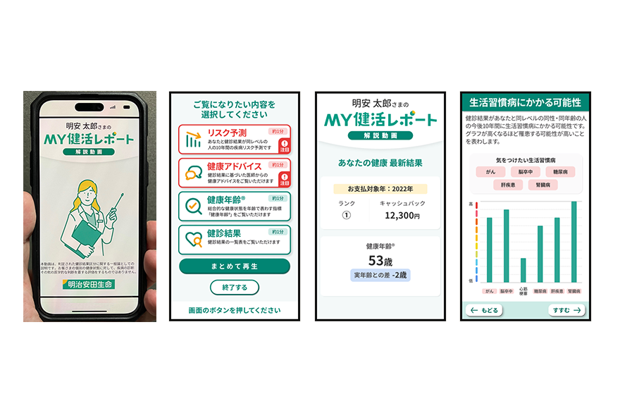 このような課題に対し、キヤノンMJはこのたびlivepassとともにパーソナライズド動画サービスを明治安田生命に導入しました。明治安田生命は、本サービスを活用し、「MY健活レポート」の新機能として、「あなたの健康解説動画」の提供を開始しました。この動画により、健康状態に応じた疾病リスク予測、健康アドバイスなどの情報を案内することで、「MY健活レポート」の利用促進を図ります。明治安田生命は、パーソナライズド動画の提供を通じて、多様化する顧客ニーズにあわせたサービスを提供することで顧客エンゲージメントの向上を目指すとともに、継続して保険加入者一人ひとりの健康維持・改善をサポートしていきます。