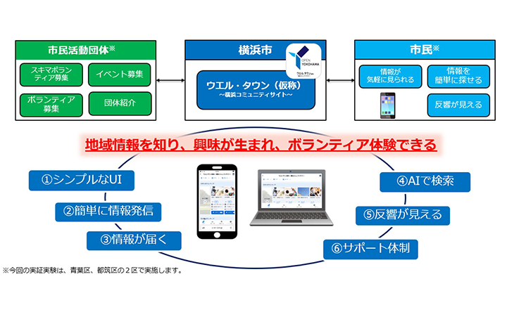 本実証実験では、「ウエル・タウン(仮称)~横浜コミュニティサイト~」を使用し、従来、紙のチラシで発信していたイベント参加者やボランティア募集といった地域情報を、スマートフォンやタブレット端末など、デジタルツールを活用して効率的に幅広い世代に届けます。デジタルポータル機能をメインとした操作しやすいUIで、スマートフォンに慣れ親しんだ学生や現役世代などに情報を届けることを重視するとともに、リアクション機能により反響の見える化にも取り組みます。またAIチャットボットによる柔軟な検索機能を搭載し利便性を高めています。プラットフォームの提供だけでなく、実証実験の期間中の操作支援やプラットフォームに関する問い合わせ窓口の設置、実証実験の効果測定も行います。