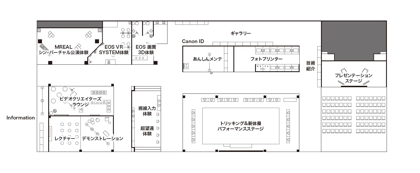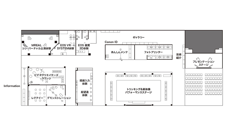 「EOS Rシステム」のタッチ&トライ、トリッキング/新体操を被写体にしたAF体験、EOS学園講師などプロ写真家によるレクチャーコーナー/デモンストレーションコーナー、映像クリエイターのための交流の場「ビデオクリエーターズラウンジ」、JVCケンウッドとのコラボレーションによるMR映像、EOS VR SYSTEMによるVR映像、写真家・映像クリエイターによるステージ、超望遠レンズ・双眼鏡タッチ&トライ、プリンター(PIXUSシリーズなど)展示、「EOS Rシステム」技術紹介、EOS画質3D、新コンセプトカメラ、PHOTOGRAPHERS`ETERNAL COLLECTION、メンテナンスサービス、「GRAPHGATE」紹介、「キヤノンフォトサークル」紹介、「Canon ID」によるオンラインサービス紹介など