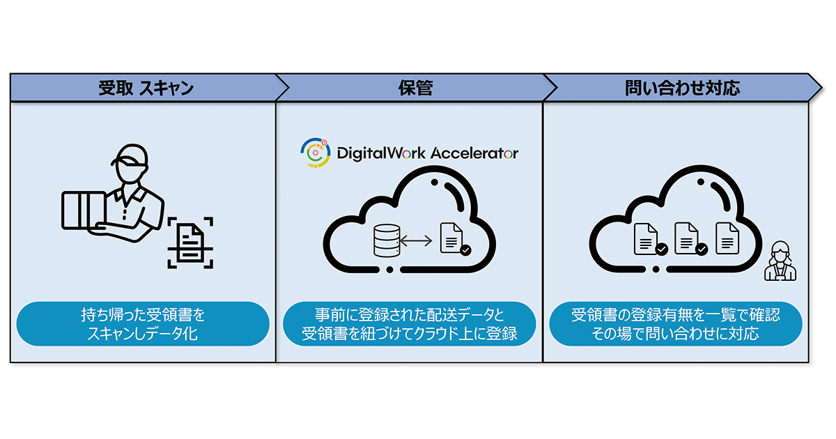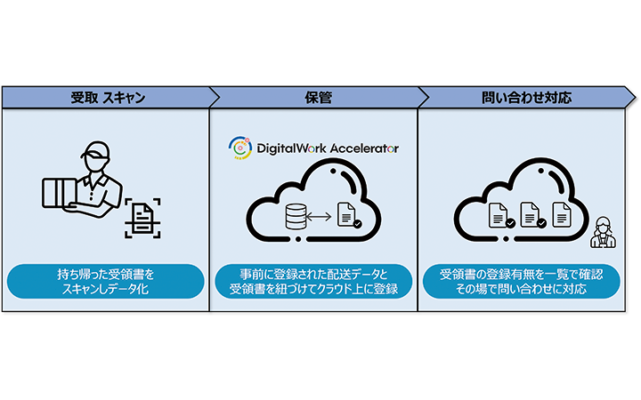 本システムは、ドライバーが持ち帰った受領書をスキャンするだけで、事前に輸送システムから連携・登録された配送データと紐づけて「DigitalWork Accelerator電子取引管理サービス」に自動保管されるため、受領書の登録有無を一覧で確認できます。また、伝票番号や車両番号、届け先などのインデックス情報がクラウド上の受領書に自動で付加されるため、対象の書類をすぐに確認することができます。