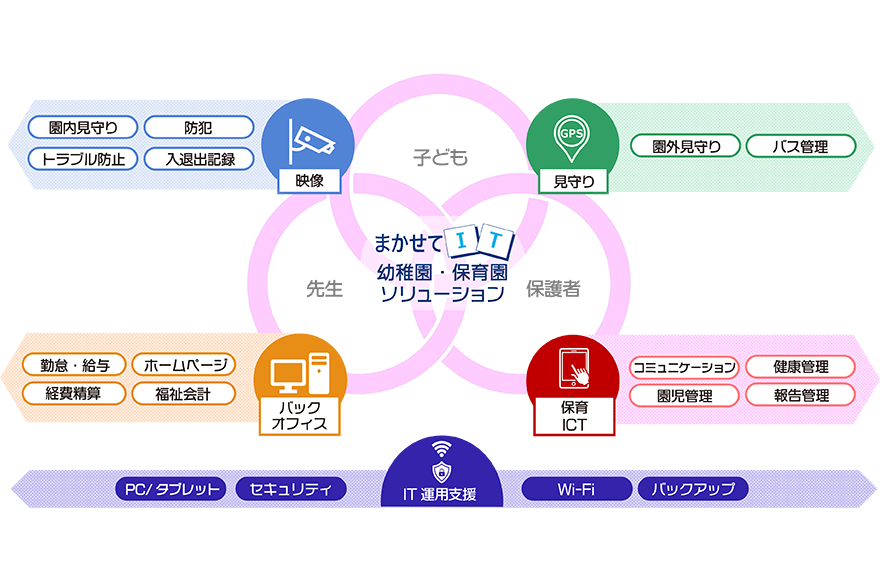 幼稚園・保育園事業者の安全対策強化と業務効率化におけるIT機器の選定、導入、運用、保守までをトータルで支援するサービスです。
