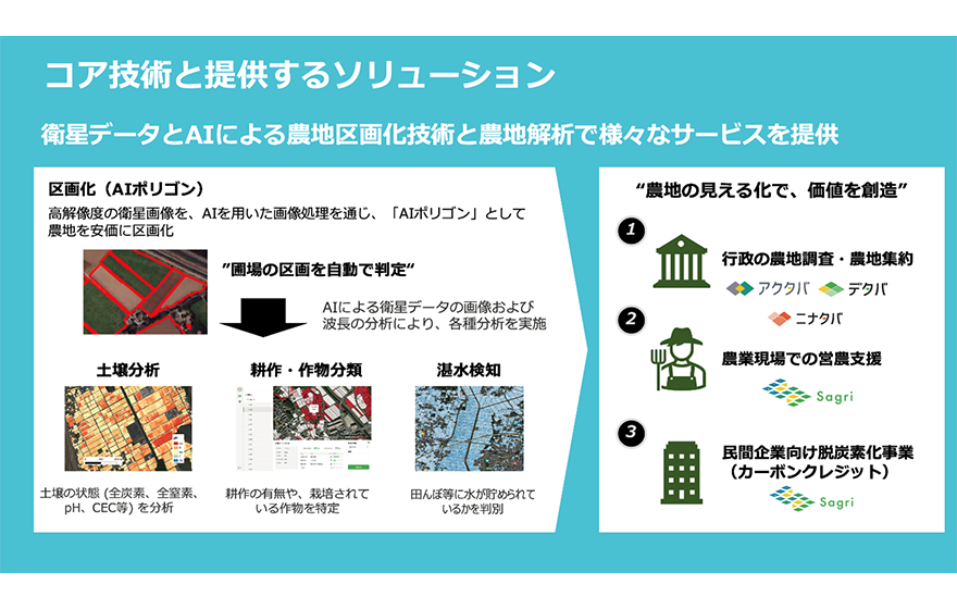 また、農地の状態把握が容易にできることで、農地管理の効率化だけでなく、肥料の使用量削減による農家の利益向上に貢献します。さらに、農地の利用状況の変化を衛星データで解析し農家の脱炭素の取り組みを裏付けることで、カーボンクレジット取得の支援を行い温室効果ガス排出量の削減に寄与することを目指しています。