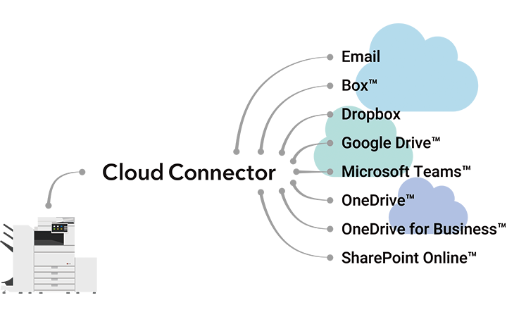 PCを介することなく、複合機から直接クラウドストレージにアクセスできるため、例えば、在宅勤務時にクラウドに保存したデータをオフィスに出社してすぐ印刷したり、メモを書き込んだ紙文書をスキャンしてクラウドに保存し、素早く社内に共有するといった柔軟な活用が可能です。このような運用によってユーザーのクラウド活用を促進し、リモートワークなど、働き方の多様化が進むオフィスにおいてもスムーズな情報共有を実現します。