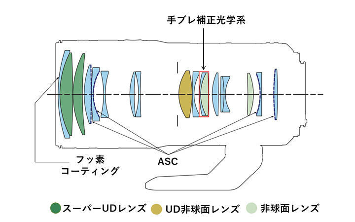 UDレンズ(UD(Ultra low Dispersion=特殊低分散)ガラスを用いたレンズ)の性能を大幅に向上させ、UD レンズ2枚分、蛍石の特性とほぼ同等の効果を備えたレンズ。