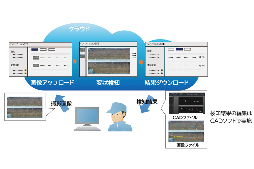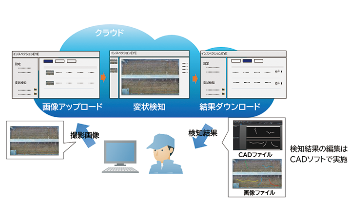 今回新たに提供を開始する“インスペクションEYE for インフラ Cloud Edition”は、AIを活用した変状検知サービスをクラウド上で行うことができるサービスです。点検作業者自身が、撮影した社会インフラ構造物の画像をクラウド上にアップロードすることで、自動的にひび割れ、エフロレッセンス(遊離石灰)、鉄筋露出、はく落、錆汁の変状検知ができます。さらに、その結果を編集し、画像/CADデータとしてダウンロードすることが可能です。点検実施者が従来手作業で行ってきた変状の記録がAIにより自動化され、クラウドから短時間で結果を入手でき、作業の効率化を実現します。