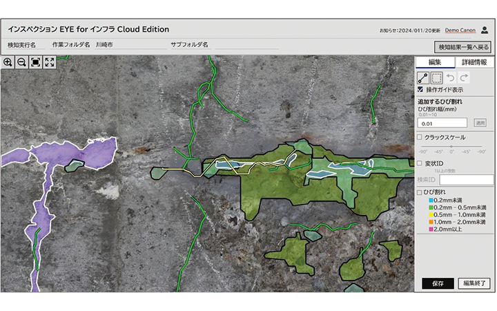 キヤノンは、点検目的で撮影したインフラ構造物の画像をクラウド上にアップロードすることで、ひび割れなどの変状を検知し、その結果をダウンロードして点検調書作成に活用可能な変状検知サービス“インスペクションEYE forインフラCloud Edition”の提供を2024年11月20日より開始します。