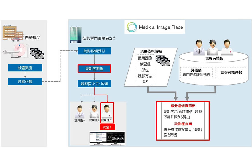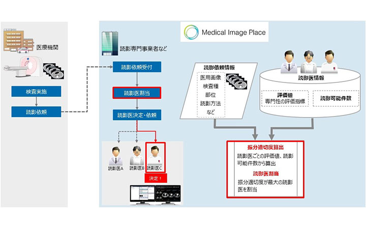 本発明は遠隔読影において、読影専門事業者などが読影依頼を受け付けた際に、複数の読影医の専門性や読影可能件数を考慮し、読影医ごとの振分適切度を算出することで自動的に担当する読影医を割り当てることができる技術です。専門性を発揮した高度かつ適切な量の読影を可能とし、読影の精度向上と読影関係者の働き方改革を支援します。