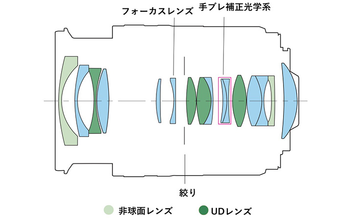 ズーム全域での開放絞り値F2.8により、自然で美しいボケ味を生かした撮影が可能です。また、大口径の「レプリカ非球面レンズ」の最前面への配置など、「非球面レンズ」2枚、「UDレンズ※2」4枚を含む13群16枚の光学設計により、画質劣化の原因となる諸収差を低減し、画面全域でLレンズに迫る高画質を実現しています。