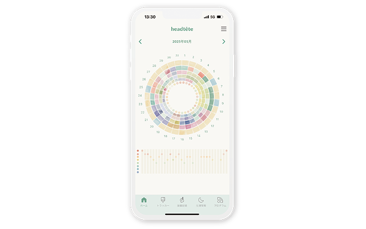 頭痛がある日だけでなく「頭痛がない日」も記録していくことで自身の頭痛に日常的に向き合うことができます。記録の習慣化を支援するため、日常の習慣や行動を記録し、追跡するツール「ハビットトラッカー」を搭載しています。頭痛の有無だけでなく、自身が設定したケアプログラムの実施状況や今日の気持ちをハビットトラッカーに記録し、色塗りの表現を楽しんでもらうことで、毎日の頭痛セルフケアの習慣化をサポートします。