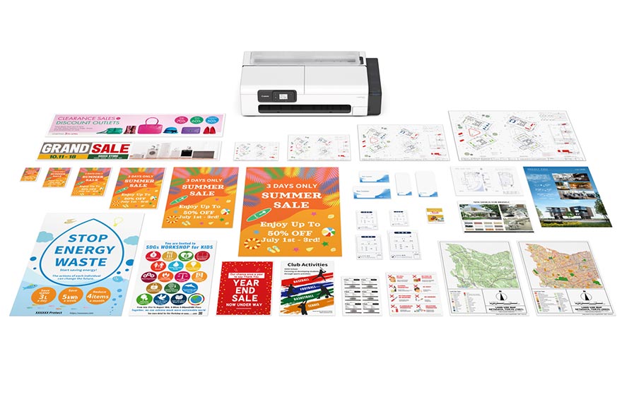 新製品は、コンパクトな筐体でスペースの限られた場所でも使いやすいデスクトップ大判プリンターです。大容量インクタンクを備え、インク補充の手間を抑えた効率的な印刷作業を可能にするとともに、新たに上下に角度調整ができるチルト式の操作パネルを採用し、従来機種※1から操作性を向上しています。ロール紙の印刷に加え、標準搭載のオートシートフィーダー(ASF)の対応用紙を拡充したことで、建築・設計の図面や、飲食店のポスター、流通・小売りのチラシ、薬局の薬袋まで幅広いプリントニーズに応えます。さらに、imagePROGRAFシリーズとして初めて※2本体の一部に再生鉄を採用するなど環境にも配慮しています。