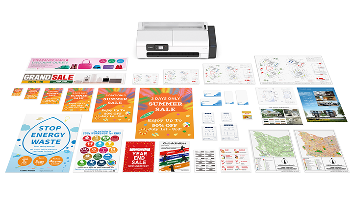 上位機種※3と同様の画像設計により、普通紙でも濃く鮮やかな色で出力できるほか、ロール紙の印刷において新たに上下の余白をゼロ、左右をごくわずかな余白で印刷する「微小余白印刷」機能※4を搭載しています。これによりデザインが引き立ち、インパクトのある印刷物が得られます。無料のウェブアプリケーション「PosterArtist」を使えば、デザイン性の高いポスターやチラシを簡単に作成することができます。
